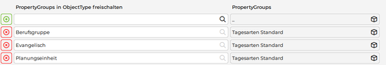 Die Gruppe Tagesarten Standard ist grundsätzlich auf Systemeinstellungen und Bereich sichtbar, kann aber bei Bedarf auf weiteren Ebenen (Vertrag, Berufsgruppe, Planungseinheit) freigeschaltet werden: