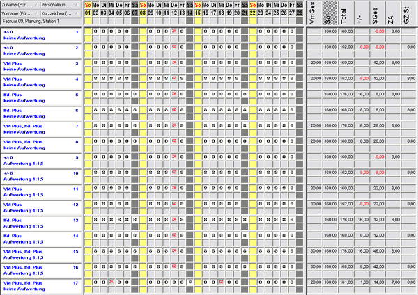 Es handelt sich um eine Vollzeitkraft mit Aufwertung (1:1,5) am Monatsende. Es kommen 30 Stunden aus dem Vormonat, außerdem wurden die berechneten Sollstunden im laufenden Monat überplant, daher ein laufendes +/- von 16 Stunden. Durch die Dienste würde ein Plus von 16 Stunden entstehen, die Gleitzeit reduziert das Plus jedoch auf 8 Stunden.