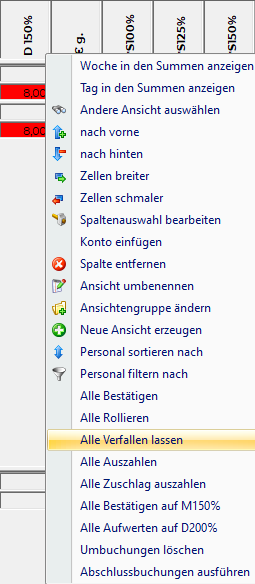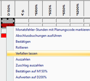 Die Funktion wird aufgerufen durch einen Rechte-Maus-Klick in der Zeile der Mitarbeiterin in der Spalte D 150% + Auswahl "Verfallen lassen