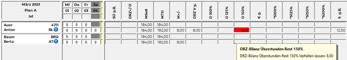 Der im obigen Beispiel angezeigte Tool-Tip zeigt die erfolgte Umbuchung bei der Mitarbeiterin Bauer: es wurden bei ihr 8 Stunden vom D 150% verfallen lassen. Die Stunden sind somit auch im DRZ V g. und S g.B. nicht mehr berücksichtigt.