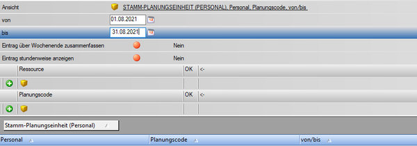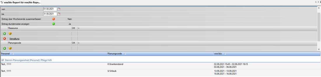 Der von/bis-Report dient zur Suche nach eingetragenen Planungscodes in Dienstplänen. Die Suche kann mithilfe der folgenden Parameter angepasst werden: