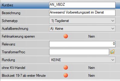 Wird die Vorbereitungszeit im Dienst durch Abwesenheit jedoch nicht reduziert bzw. gilt sie nicht als erbracht, kann für den jeweiligen Planungscode der Parameter " Vorbereitungszeit im Dienst rechnen" gesetzt werden.