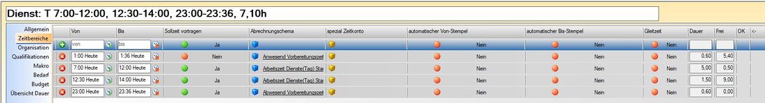 Die Vorbereitungszeiten im Dienst können dann über einen Planungscode eingetragen werden.