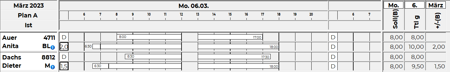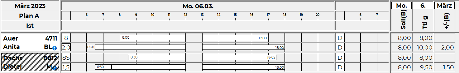 Wird bei Mitarbeiter Dachs am 6.3. im Ist eine Zeit ab 6:30 - 18:00 erfasst, so soll diese erst ab 7:30 Uhr - 18 Uhr ins Total angerechnet werden.
