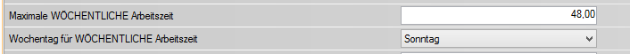 Anzahl der maximalen Stunden, welche pro Woche gearbeitet werden dürfen. An welchem Wochentag die Prüfung stattfindet, muss im Parameter "Wochentag für WÖCHENTLICHE Arbeitszeit" definiert werden.