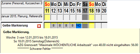 Maximale WÖCHENTLICHE Arbeitszeit: Gelber Balken für AZG-Fehlermeldung