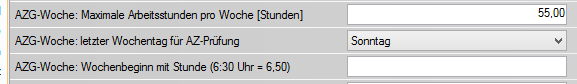 Anzahl der maximalen Stunden, welche pro Woche gearbeitet werden dürfen. An welchem Wochentag die Prüfung stattfindet, muss im Parameter "AZG-Woche: letzter Wochentag für AZ-Prüfung" definiert werden.