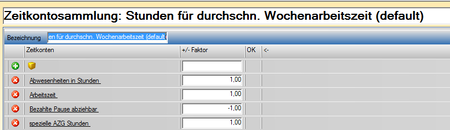 Mit dem grünen Plus kann eine eigene Zeitkontosammlung angelegt werden. Es wird jedoch empfohlen "Stunden für durchschn. Wochenarbeitszeit (default)" zu kopieren und anschließend jene Zeitkonten hinzu zu fügen, die heraus gerechnet werden sollen. Das Zeitkonto wird heraus gerechnet in dem bei "+/- Faktor" -1 eingegeben wird.