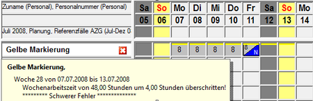 Damit man zusätzlich zur Fehlermeldung in der Namensspalte auch noch eine farbliche Markierung der entsprechenden Woche bekommt, kann man die gelbe Markierung aktivieren. (Achtung: Parameter standardmäßig nur auf System verfügbar) Ist dieser Parameter auf "Ja" gesetzt und es entsteht eine Überschreitung der wöchentlichen Arbeitszeit, so wird die betroffene Kalenderwoche wie folgt markiert: