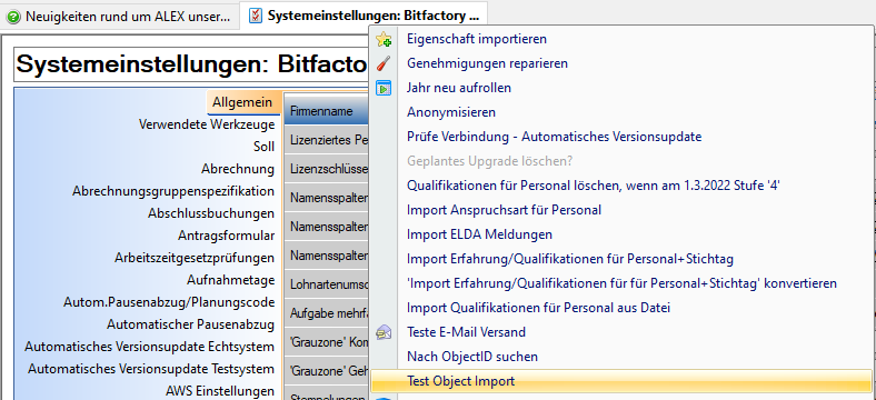 Unter Systemeinstellung -> rechte Maustaste auf Reiter -> Test Object Import kann ein Eingabefenster geöffnet werden.