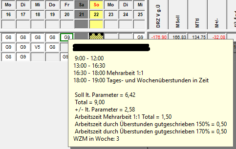 Nach Markierung des Wochenfehlers mit Planunungscode, ist gut zu erkennen, dass die ersten 1,5 Stunden mit Mehrarbeit 1:1 belegt werden, und die Stunden darüber hinaus mit Überstunden.