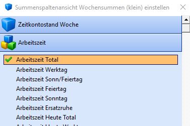 Nachdem die Ansicht benannt wurde (z.B. Wochensummen), öffnet sich die Werteauswahl. Um beispielsweise die wöchentliche Arbeitszeit anzeigen zu lassen, wird das Konto "Arbeitszeit Total" ausgewählt. Es ergeben sich hier vielfache Einstellungsmöglichkeiten, je nachdem welches Konto man sich anzeigen lässt.