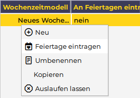 • Soll das Wochenzeitmodell auch an Feiertagen eingetragen werden, klicken Sie mit der rechten Maustaste auf das erstellte Wochenzeitmodell und wählen Sie "Feiertage eintragen" aus.
