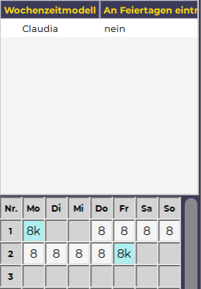 • Um das Wochenzeitmodell im Monatsplan einzutragen, wird auf die entsprechende Zahl (=Woche) geklickt (z.B. "1") mit welcher der Mitarbeiter startet und in den Monatsplan in die entsprechende Woche hineingelegt.