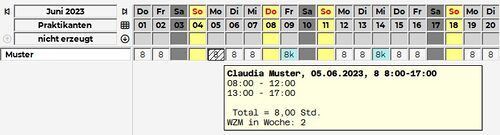 • Im Tooltipp des Tages wird angezeigt, in welcher Woche sich der Mitarbeiter laut seinem Wochenzeitmodell befindet.