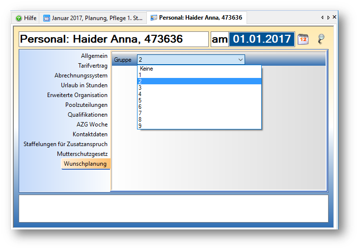 Achtung: Die Gruppe muss im Personalstamm per Stichtag ab jenem Datum hinterlegt werden, ab welchem der Benutzer erstmalig einsteigen möchte. (wenn zB die Wunschplanung mit dem Septemberplan startet, muss bereits ab ca. Juni/Juli die Gruppe bei den Mitarbeitern hinterlegt sein).